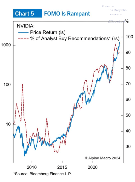 4. FOMO on Wall Street: This one is kind of interesting for 2 reasons. First is how consensus it is to be in love with NVIDIA (near 100% of analysts have buy ratings on it). Second is how no one seemed to see it coming… not long ago less than a 3rd had buy ratings on the thing. Goes to show it’s only obvious in hindsight (but then also that reminds me the saying from the late great Joe Granville: “if it's obvious, it's obviously wrong”).