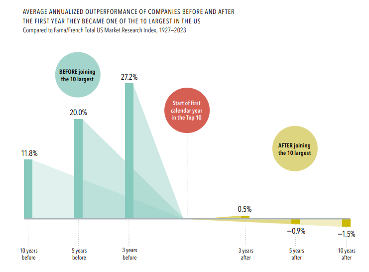 Makes sense, it’s harder mathematically to grow fast when you’re already king of the hill, you also become a target for competitors, and often that journey involves significant valuation increases (as people over-extrapolate and over-value the company). Maybe informative for the current surge in largest caps.