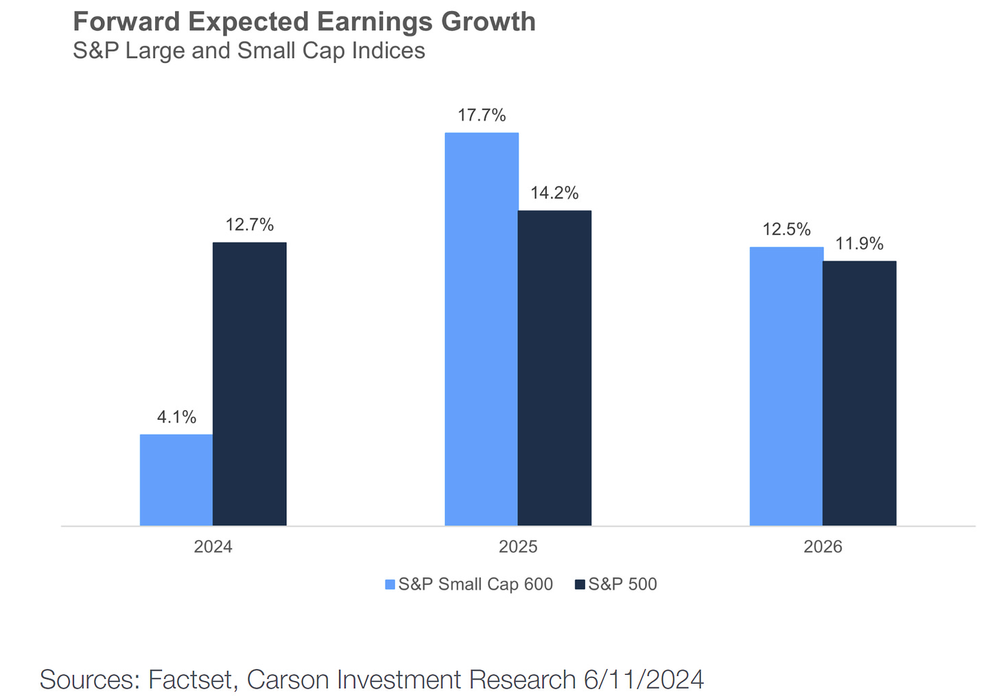 7. Earning it: If small caps are to sustainably outperform vs large caps there’s going to need to be a shift in earnings performance — and that happens to be exactly what analysts are anticipating. While in 2024 large caps are set to significantly outperform small caps on earnings, small caps are set to outperform large in 2025-26 according to analyst consensus estimates…