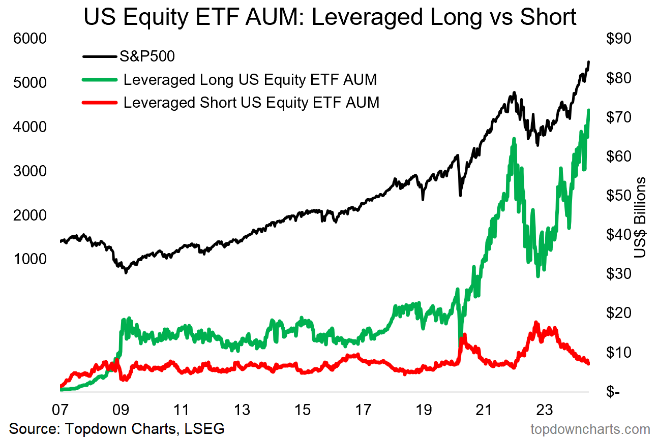 1. Long and Short of it: Assets Under Management in leveraged long US equity ETFs has reached further new highs (partly the result of market movements, but also investors/traders just going with it), meanwhile leveraged short/inverse ETF assets are back to the low end of the range. I think it would be correct to call this a contrarian signal, and a sign of where sentiment and positioning is at right now.