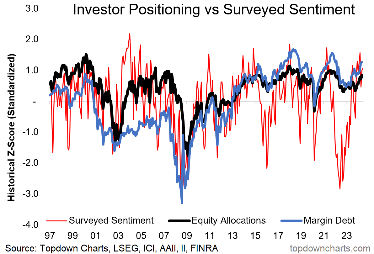 3. Hearts and Minds: Another angle on it, this time looking at the more erratic surveyed sentiment in the red, and portfolio allocations to equities in the black (with margin debt vs market cap in the blue). On all fronts the data is consistent; investors are all-in on stocks both mentally/emotionally and physically as far as positioning or actions go.