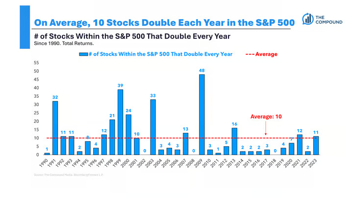 9. Doubling Up: Interesting pulse check, this one shows the annual number of stocks in the S&P500 that saw their stock price double. This indicator is going to go really high when you have a crazy bull market (e.g. 1999) or a sharp recovery from a deep drawdown (e.g. 2009). Curious that there wasn’t many doublers in the early-2000’s or 2010’s (is that an indexing/passive investing thing? I wonder — all stocks are treated equal by passive as money flows in and out according to market cap).