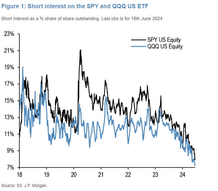 2. Shorter: On a similar note, short interest in the major US equity ETFs (SPY = S&P 500, QQQ = Nasdaq 100) has collapsed as basically no one in their right mind would stand in front of the one-way freight train that is the US Stockmarket.