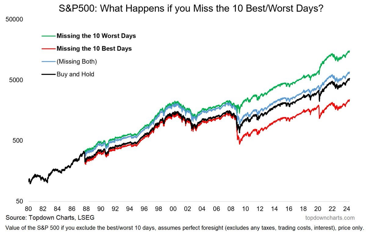 10. Best and Worst: You might have seen a version of this that says what happens if you miss the 10 best days and then concludes that you shouldn’t bother trying to time the market or even think about prudent risk management (let alone diversification and asset allocation). But they rarely show you what would happen if you missed only the 10 *worst* days, or better yet, what happens if you missed both (better than buy and hold — partly a sequencing thing, many of the best AND worst days happened during highly volatile/crashing markets). Critical thinking reminder!