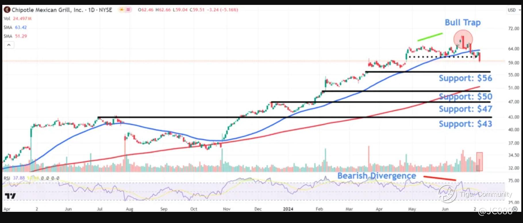 On Mon, 08 Jul 2024, CMG’s shares closed below its key support $61.50 per share, on above-average volume, raising the possibility for further declines in the weeks ahead.