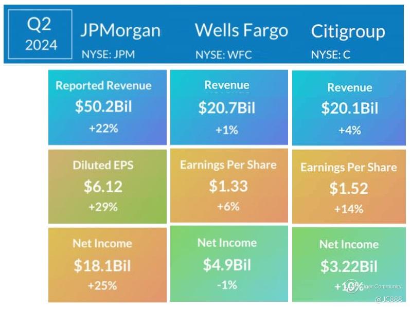 On Fri, 12 Jul 2024, $JPMorgan Chase(JPM)$, $Wells Fargo(WFC)$ and $Citigroup(C)$ reported their second-quarter earnings.