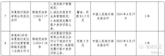2024年6月末,因違反反假貨幣業務規定等三項違法違規行爲,華夏銀行武漢分行被處以80多萬元罰款。