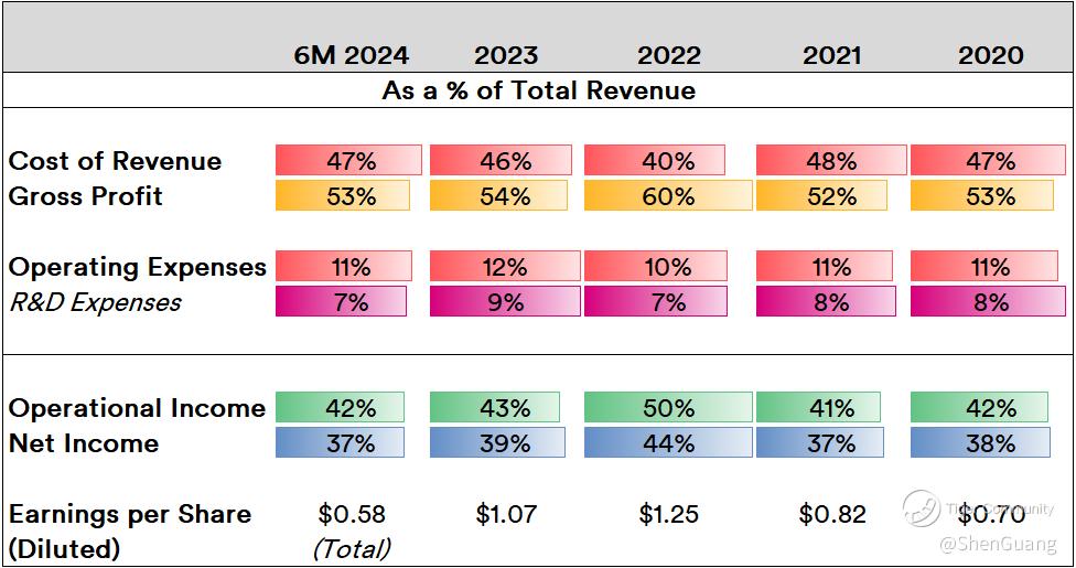 If current trends were to continue, both revenue and earnings per share (EPS) can be expected to end 2024 at about 12% and 8% above those of 2023 respectively. With operating expenses only trending at a 2% excess in projections, the double-digit increase trend seen over the past three FYs could be ending. However, cost of revenue is inching closer towards the Year-on-Year (YoY) increase last seen in 2021 and greater than the steady 8% increase seen over the past two FYs. This might have an impact on the current projections made on EPS and depress it lower.