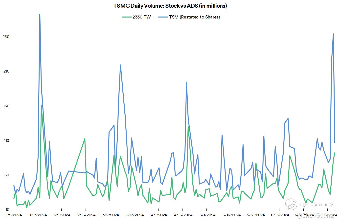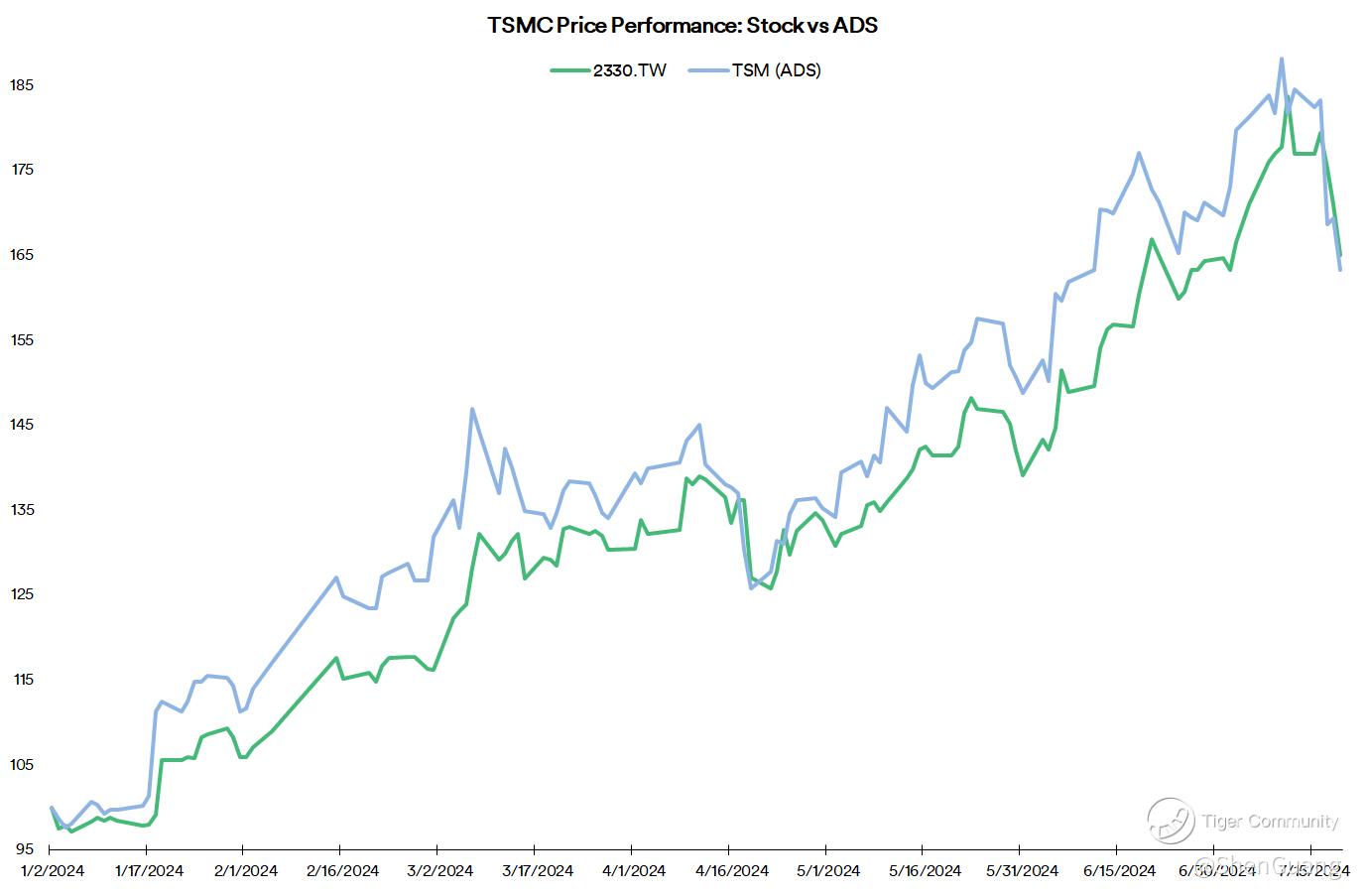 The company's stock is originally listed in the Taiwan Stock Exchange with ticker code "2330" but is made available in U.S. bourses in much the same way as Chinese companies' shares are: the right to profits (as opposed to ownership) are vested into an "American Depositary Share" ("ADS", which is not the same as an American Depositary Receipt or "ADR") such that each ADS equals 5 shares.