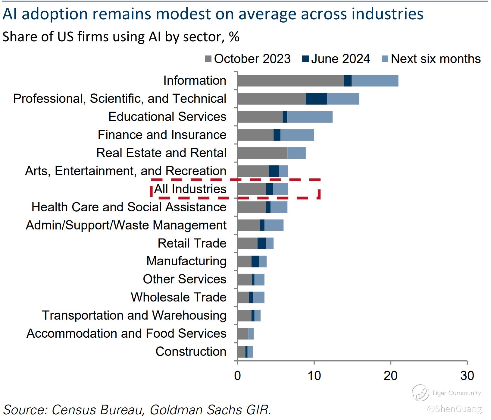 One great promise of AI would be the automation of low-wage jobs and subsequent cost savings. Jim Covello, Goldman Sachs’ head of global equity research, pointed out that, at current commitment levels, companies' investments wouldn't be recouped even if that were to hold true. Goldman Sachs' senior US economist Joseph Briggs, in the very same note that held Jim Covello's commentary, was relatively more bullish on AI and estimates that well under 10% of U.S. firms across sectors use AI: