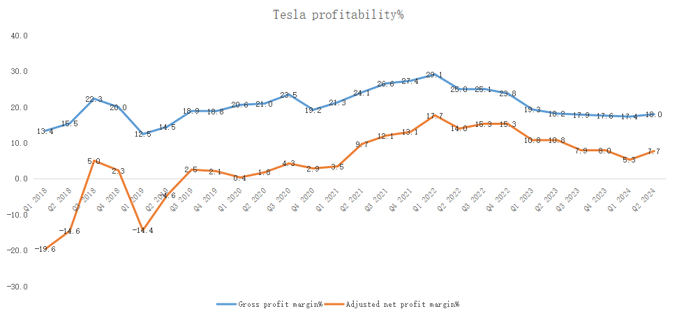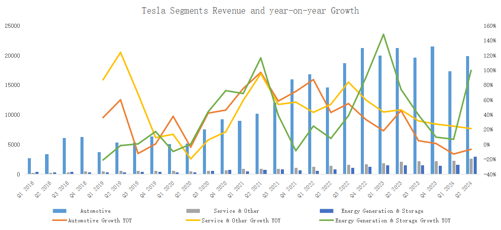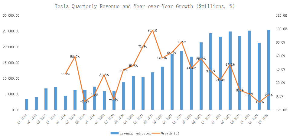 In terms of performance, Tesla's Q2 results were commendable. Revenue reached $25.5 billion, up 2.3% year-over-year, surpassing analysts' expectations of $24.63 billion: