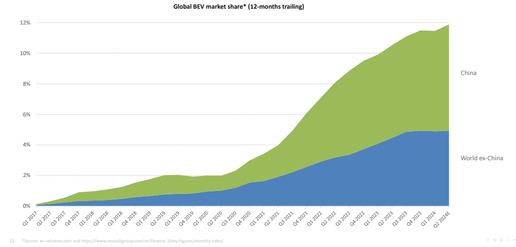 In terms of bettery electric market share, China is recovering momentum, while other countries are underperforming, posing ongoing sales pressure for Tesla: