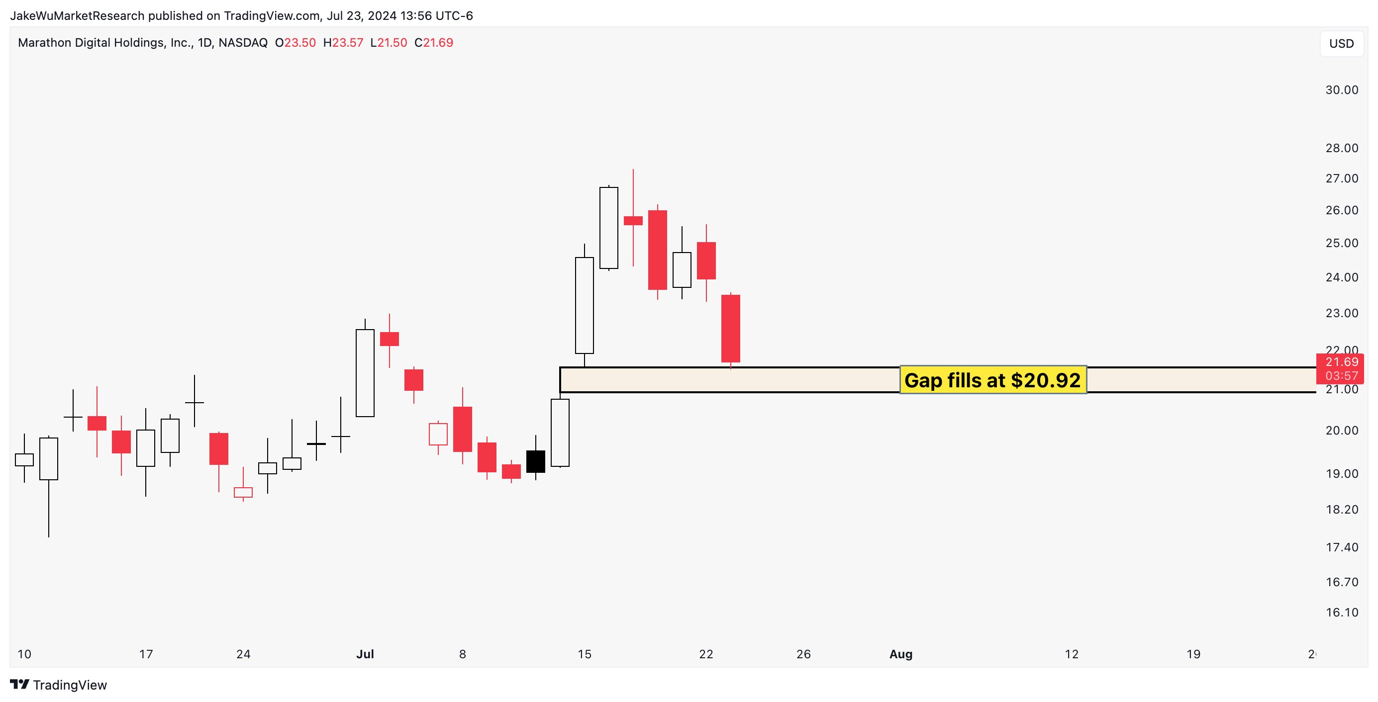$Marathon Digital Holdings Inc(MARA)$ If #Bitcoin continues to breakdown, the gap below at $20.92 is the main level to watch as potential support.