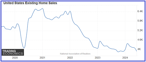 Since January 2021, when the existing home sales SAAR was 6.6 million, the metric has plunged 41%. Unsold listings jumped to 4 months' supply, up 29% YoY to the highest level since May 2020. Including condos and co-ops, inventory is at 4.1 months' supply, and it has soared 57.6% YoY.