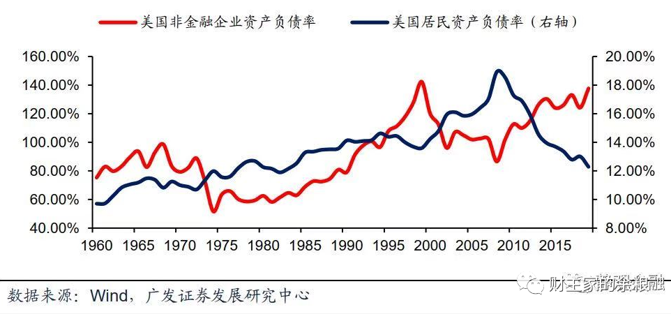 2008年以後,美國家庭部門進入長期去槓桿時間,而企業部門則又開始了新一輪債務擴張,到了2019-2020年,企業部門的資產負債率一路擡升到再次接近140%的水平,而家庭部門的資產負債率則降至1980年代接近12%的水平。