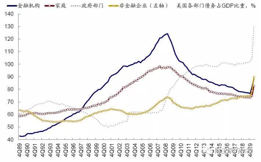 爲了讓經濟保持持續擴張,政府和金融部門,一定會鼓勵居民部門和非金融企業部門的債務持續上升——如果某個部門債務到達極限,那麼就會引爆一場金融危機,接下來,就會出現非金融企業部門和居民部門債務交替上升的情況。