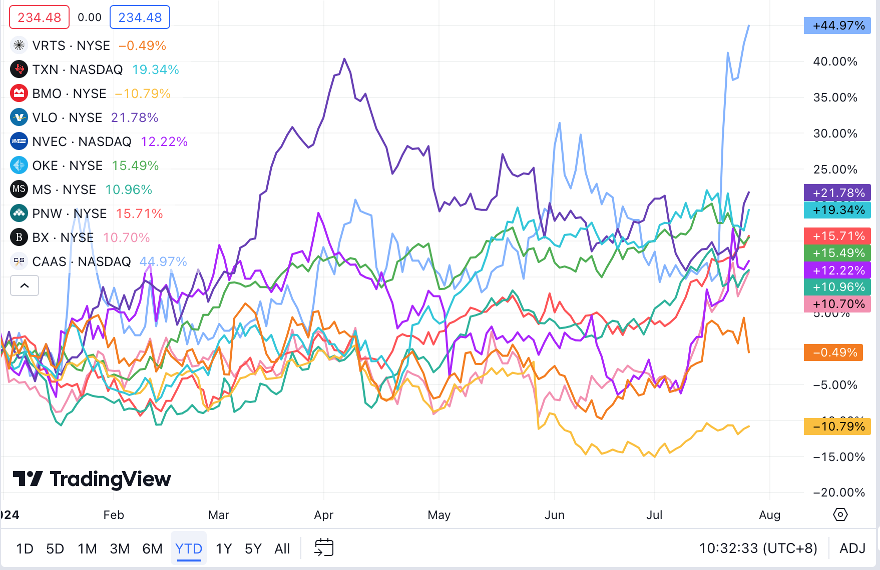 According to a TradingView data chart, as of the publication date, $Texas Instruments(TXN)$ , $Valero(VLO)$, $NVE Corp(NVEC)$ , $ONEOK Inc(OKE)$, $Morgan Stanley(MS)$, $Pinnacle West Capital(PNW)$ , $Blackstone Group LP(BX)$, and $china automotive systems(CAAS)$ have all seen gains in 2024. Conversely, $Virtus Investment Partners(VRTS)$ and $Bank of Montreal(BMO)$ have reported losses for the year.