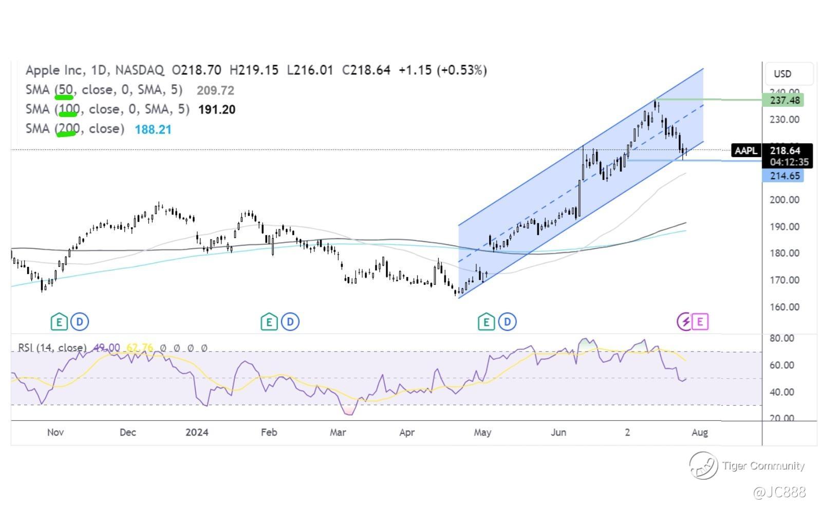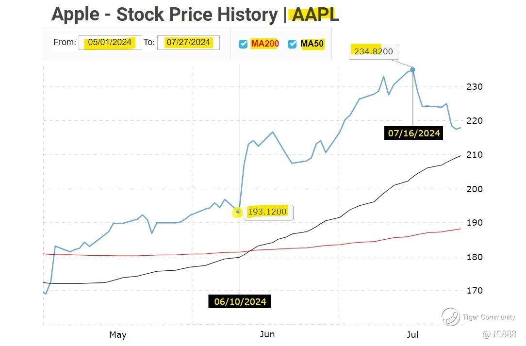 Apple’s Tue, 30 Jul 2024 closing price was $218.80 per share.