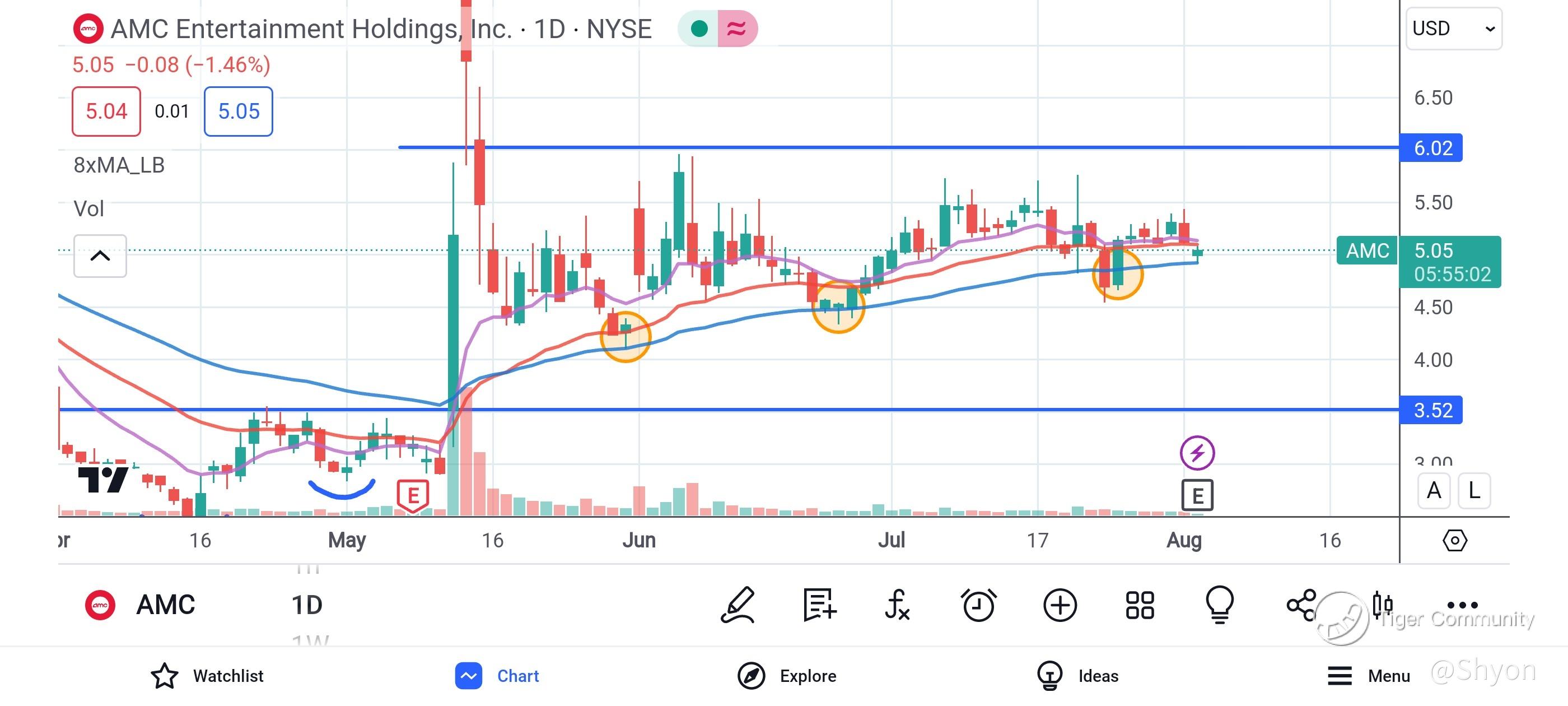 If we look at AMC chart from technical aspect, AMC seems to have a strong support at EMA50 (blue coloured EMA line). As shown in the highlighted circles, for the past 2 months, the share price has rebounded well once it touched the EMA50 line, for at least 3 times. This week, AMC showed the similar pattern and I believe this will cause AMC $AMC Entertainment(AMC)$ to surge again in near term. Anyway, I believe the incoming earnings will be the key decider.