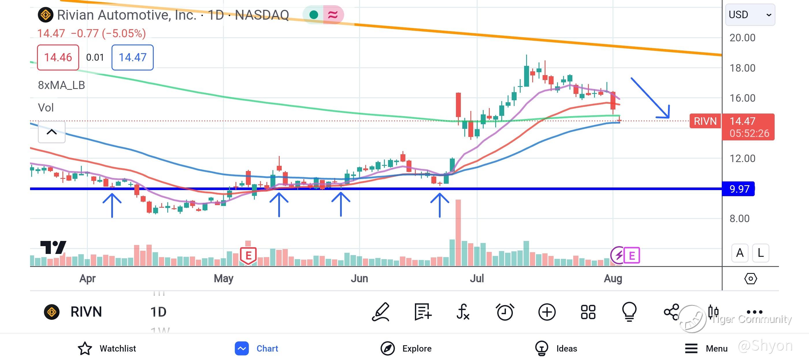 For Rivian, the share price retraced together with the bearish market and it seemed to struggle to stay above EMA 200 support this week. Next week will be critical for Rivian, if the share price fails to stand back above to EMA200, we will see a continuous correction in Rivian$Rivian Automotive, Inc.(RIVN)$  price. Anyway, the incoming earnings will be the key decider.