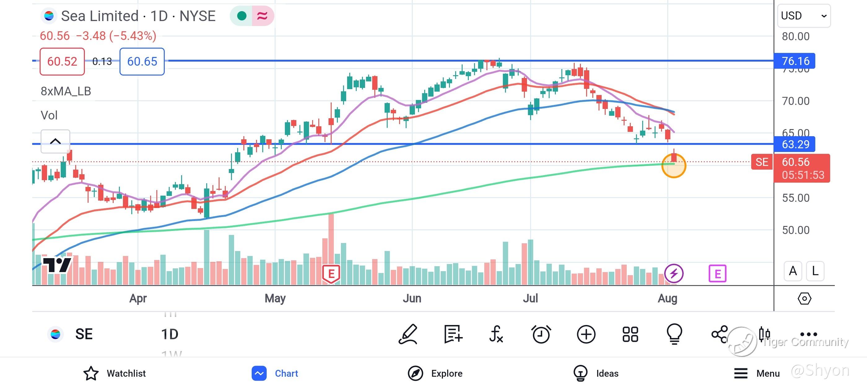 By referring to the chart above, Sea seems to be in a consolidation phase for the past 3 months. 76 USD becomes a triple top resistance and 63.29 USD acts as a near term support for Sea. However, last night Sea plummeted towards 60 USD until it reached its EMA200 support. I believe this is a very strong support for Sea $Sea Ltd(SE)$ and we should at least see a technical rebound in its share price in very short term, probably by next week.