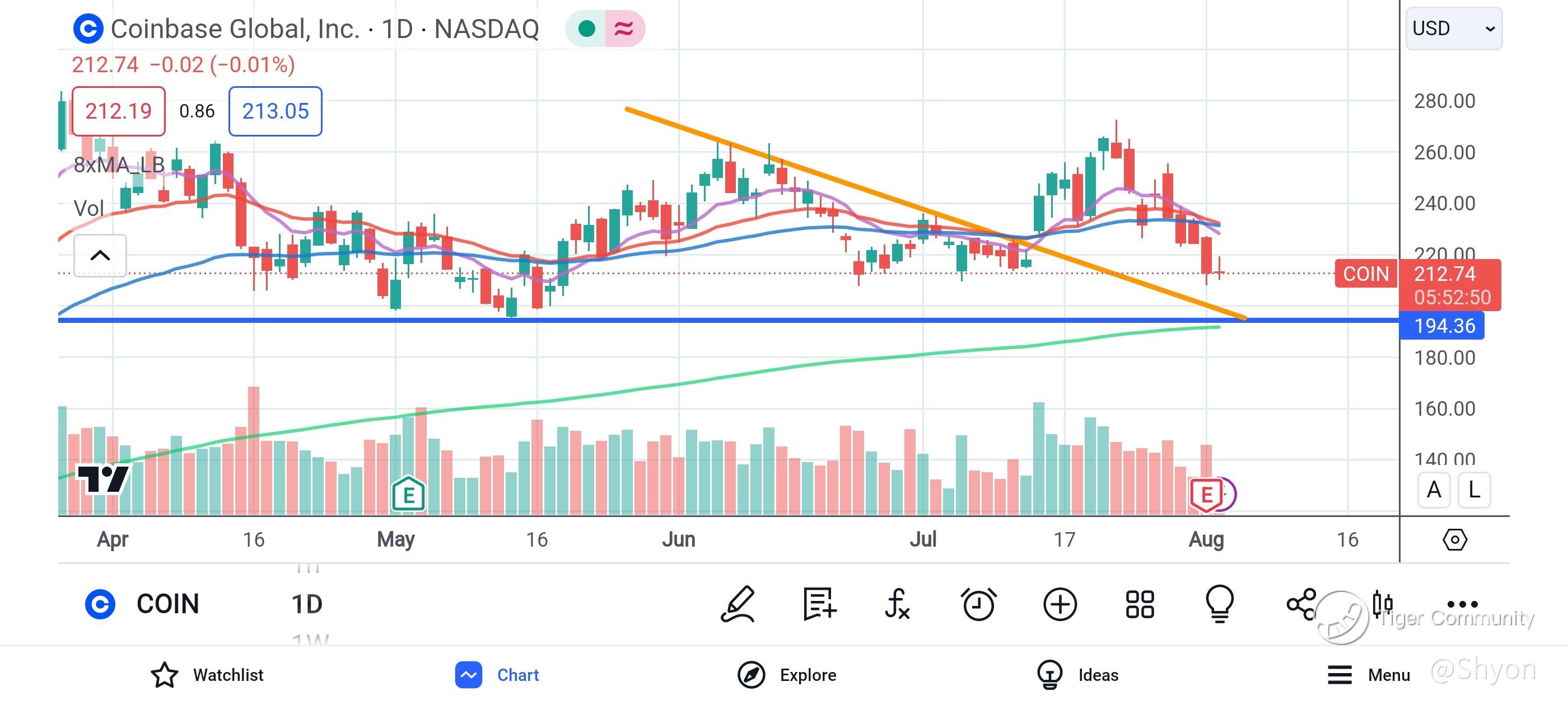 For COIN, the stock retraced following the bearish market sentiment in crypto sector this week. Moreover, the share price failed to sustain above EMA50 trendline support. We can also see a dead cross ❌ formation between EMA 25 and EMA 50 this week. The nearest support will be at 194.36 USD which is pretty near with current price. I bet Coin $Coinbase Global, Inc.(COIN)$  will rebound next week as it is close to EMA 200 now where there will attract a number of technical buyers.