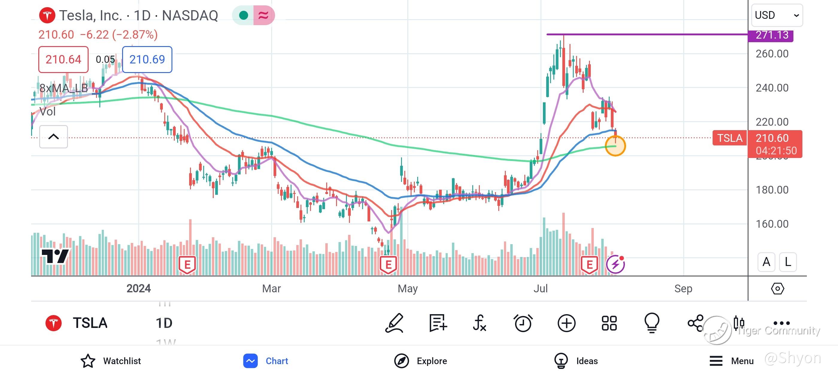 Let's look at the Tesla chart shown above, following a disappointing earnings results, Tesla share price pullbacked significantly this week towards its EMA50 then EMA200 support, which should act as a very strong support. For me, as long as Tesla can stay firm above 200 USD, I remain my bullish view on Tesla $Tesla Motors(TSLA)$