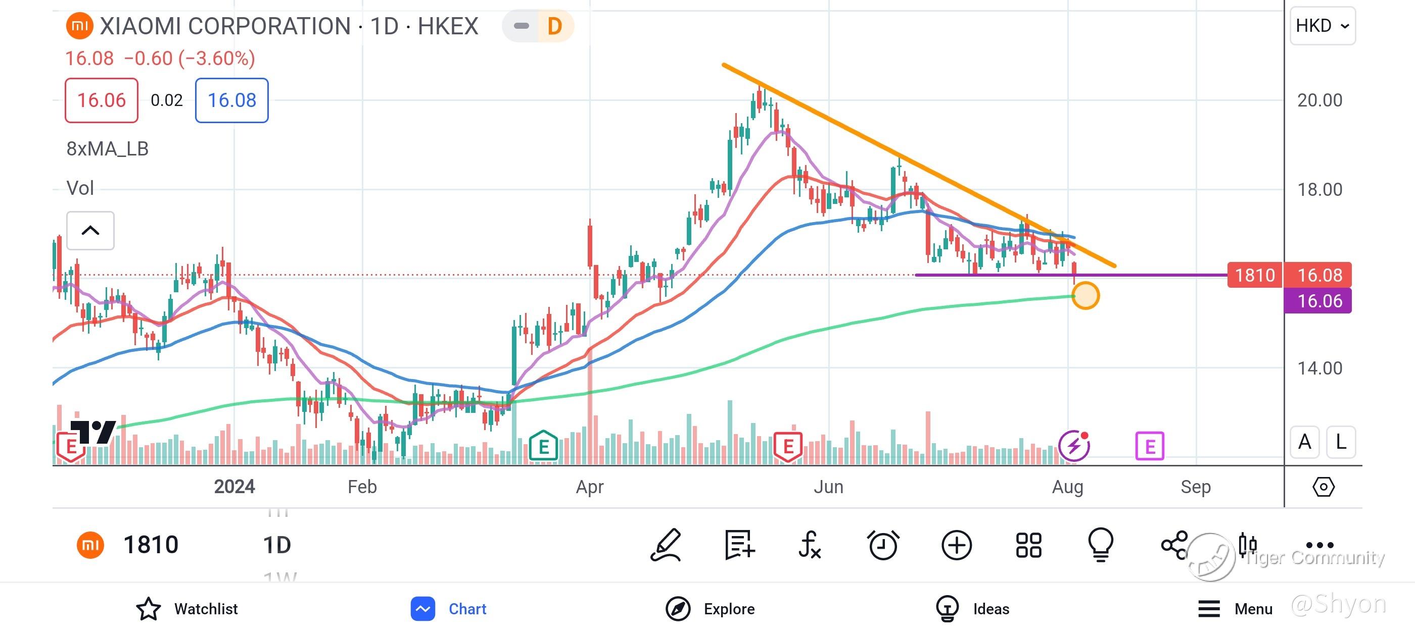 After a massive rally since March 2024, Xiaomi experienced a bearish movement after May 2024. The pullback was beyond my prediction until it headed towards EMA200 support recently. The good news is Xiaomi share price seems to find its short term bottom at around 16 HKD. A hard prediction for Xiaomi as the share price is moving inside its descending triangle pattern. Although the downtrend is clear and obvious for Xiaomi, but I tend to give it a bullish vote next week as the share price is pretty close to EMA200 critical support now, a technical rebound should be expected here. Definitely not a good price to short here, therefore a bullish vote for Xiaomi $XIAOMI-W(01810)$