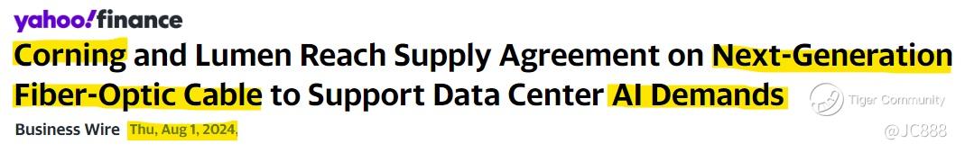 On Thu, 01 Aug 2024, LUMN announced an agreement to reserve 10% of $Corning(GLW)$ global fiber capacity to be used, to interconnect AI-enabled data centers.