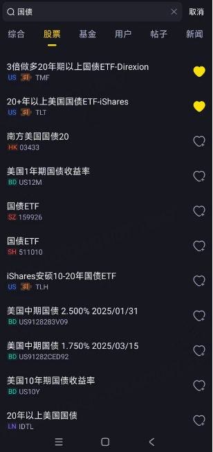 大家可以在老虎证券的搜索栏搜索“国债”字样,在弹出来的ETF标的中选择,最典型的有TLT,TMF等