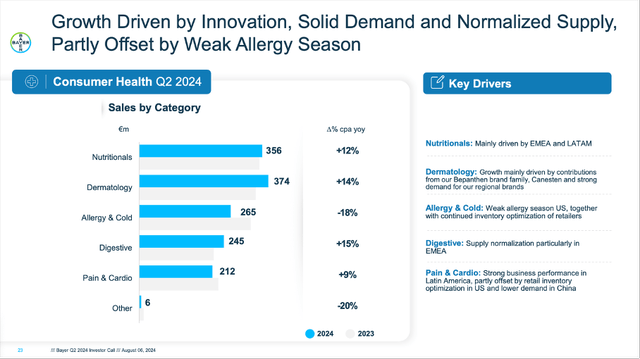 And finally, Consumer Health sales also declined slightly from €1,466 million in Q2/23 to €1,458 million in Q2/24. EBITDA before special items also declined 6.3% year-over-year from €335 million in the same quarter last year to €314 million this quarter. However, we should point out that currency effects had a negative impact here and adjusted for currency, sales would have grown 5% year-over-year. And aside from Allergy & Cold, which declined 18% YoY, all other sub-segments grew at a solid pace. Pain & Cardio increased 9% and Nutritionals, Dermatology and Digestive increased even in the double digits.