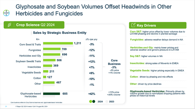 We can also look at the three different segments in more detail and start by looking at Crop Sciences. While sales increased slightly from €4,924 million in Q2/23 to €4,981 million in Q2/24, EBITDA before special items declined 27.8% year-over-year from €725 million in the same quarter last year to €524 million this quarter. And while fungicides, herbicides (excluding glyphosate) and cotton declined in the double digits, it was especially glyphosate-based herbicides growing with a high pace – 42% year-over-year to €685 million in quarterly sales. Growth here was driven by a 12% price increase, but especially by 30% volume growth.