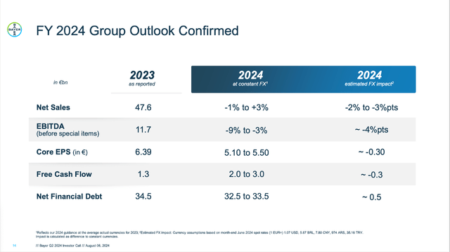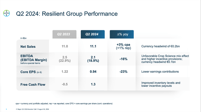 Let’s start by looking at the results, which were nothing to get excited about but also no disappointment. Sales increased slightly from €11,044 million in Q2/23 to €11,144 million in Q2/24 – resulting in 0.9% year-over-year top-line growth. Volume increased 1.6% YoY and price increased 1.5% YoY, leading to FX and portfolio adjusted sales growth of 3.1%. And instead of a negative EBIT of €956 million in the same quarter last year, Bayer could report a positive EBIT of €525 million again. However, Bayer still had to report a loss per share and despite an improvement from a loss per share of €1.92 in Q2/23 to only a loss per share of 3 cents in Q2/24, the bottom line is still a disappointment.