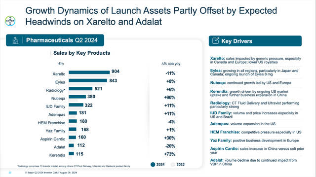 While Crop Sciences is still struggling a bit, Pharmaceuticals performed a little bit better. Sales also increased a little bit from €4,557 million in the same quarter last year to €4,605 million this quarter. EBITDA before special items also declined, but only 4.1% from €1,379 million to €1,322 million. Growth was especially driven by blockbuster Eylea, which grew 8% year-over-year to €843 million in quarterly revenue. And Nubeqa, which has already reached blockbuster status, grew 90% year-over-year to €380 million quarterly revenue. On the other hand, Xarelto sales declined 11% YoY due to generic pressure, especially in Canada and Europe, but the drug is still generating €904 million in quarterly sales.