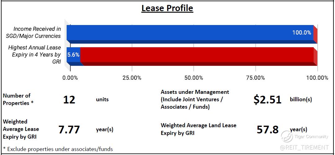 WALE is long with no major lease expiries in the next 4 years. However, the weighted average land lease expiry is relatively short.