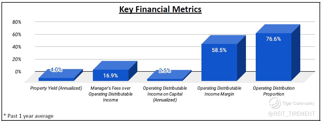 The operating distributable income margin is high, but property yield, operating distributable income on capital, and operating distribution proportion are relatively low.