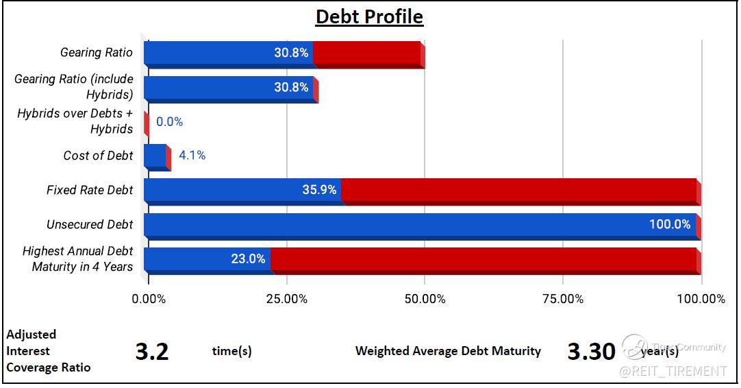 Compared to the previous half-year, gross revenue has declined slightly, but NPI remains similar due to lower property expenses. Distribution and DPS have also declined due to higher finance expenses, lower management fees payable in units, and the absence of retention release. There is no refinancing requirement for debt in 2024, with 22% of debt maturing in 2025.