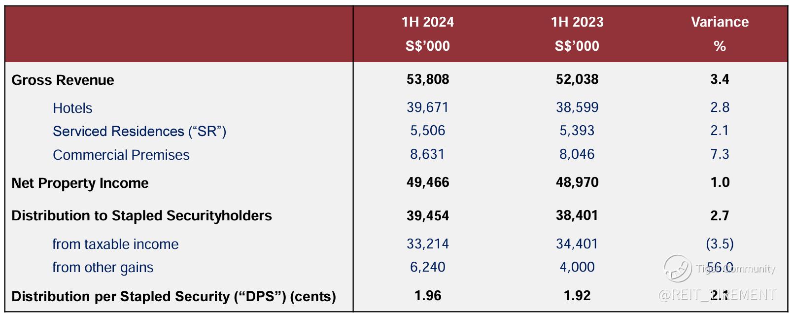 Gross revenue and NPI have improved slightly due to better performance from existing properties. Despite a significant increase in finance expenses, the distribution and DPS have increased YoY mainly due to lower distribution retention and an additional S$2.2 million distribution related to the divestment of Central Square.