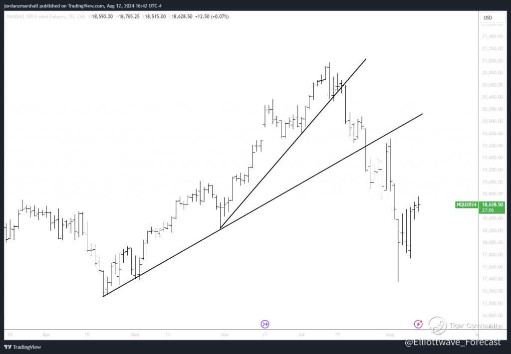 Here Nasdaq Futures are increasing from the 19th of April to the 11th of June, 2024. I drew two lines for this major trend. This upper line uses two pivots from May 31st to 01 July, and the other from 19 April to 31 May (lower trend line). For each trendline, the price started trading in a downward trend after breaking through these lines.