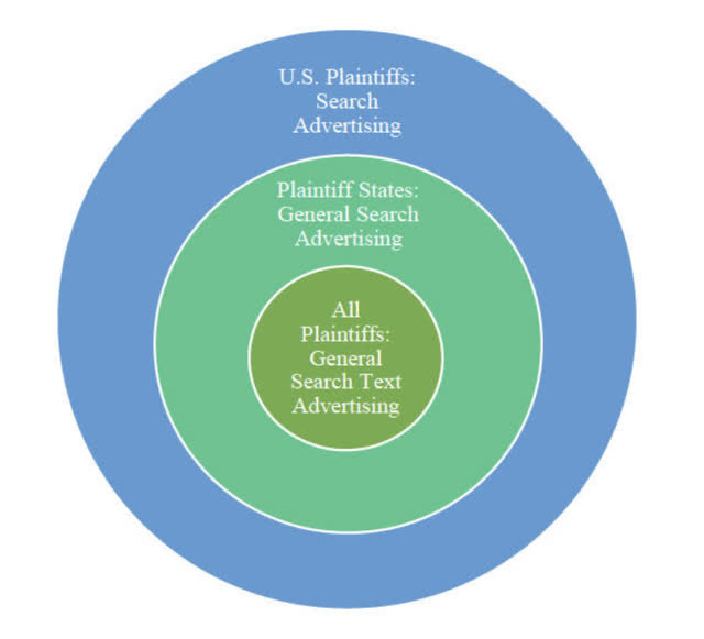 Plaintiffs collectively assert that Google has monopoly power in three overlapping advertising markets. These markets and their relationships are illustrated below. U.S. Plaintiffs allege the broadest proposed market, search advertising, which includes all advertisements served in response to a query, regardless of the digital platform. Within the search ads market, Plaintiff States define a general search advertising market that includes only ads served on GSEs. Finally, both sets of Plaintiffs propose a general search text advertising market, limited to text ads appearing on a GSE’s SERP.