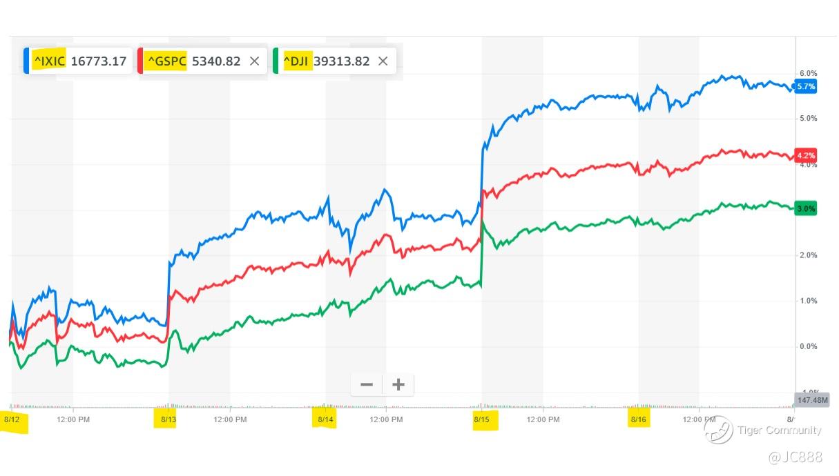 For week ending 16 Aug 2024, all three indexes recorded their biggest weekly percentage gains since late October, with the S&P 500 and the Nasdaq posting their first weekly gain in five.