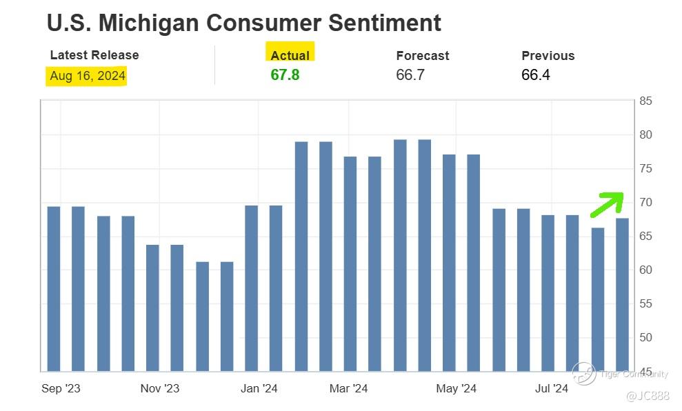 Consumer sentiments (actual-preliminary for August 2024) came in at 67.8.