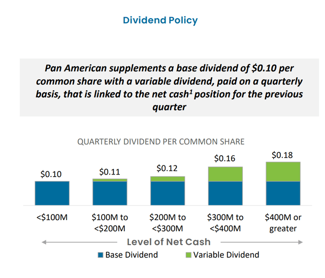 Finally, as for Pan American's dividend policy, the company is already paying a leading dividend among its silver peers ($0.40/year), but is set to see an increase in its dividend by H2-25, with the potential for a material increase in 2026. This is because the base dividend is supplemented by a 10% increase ($0.01) to $0.11 if Pan American holds $100 million to $200 million in cash, increasing further to a 20%, 60% increase and 80% increase in the base dividend if Pan American is holding upwards of $400 million in cash. Given that I would expect Pan American to have upwards of $400 million in cash net by Q2-26 even under conservative assumptions, investors that bought under US$15.00 have certainly locked in a very nice yield, with the potential for an annual dividend of US$0.60+ in 2026 (~4% yield).