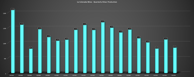 Digging into the production results a little closer, La Colorada's Q2-24 production came in at ~835,000 ounces (ca. 32 t) of a silver, down 27% year-over-year. While disappointing, this is related to continued ventilation constraints that have contributed to the downtrend in silver production (below chart), with limited access to deeper higher-grade zones of the mine. As noted above, mining rates are already improving following the completion of ventilation infrastructure, and La Colorada will benefit from higher throughput and grades going forward.