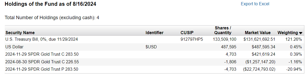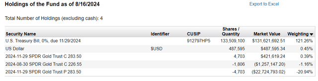 Looking at IGLD's portfolio, we can see that a synthetic long position in GLD is established by the November 29, 2024 expiry GLD calls and puts with a $283.50 strike price. Meanwhile, the IGLD ETF writes monthly calls to generate premium income. The IGLD also holds short-term treasury bills to generate additional income.