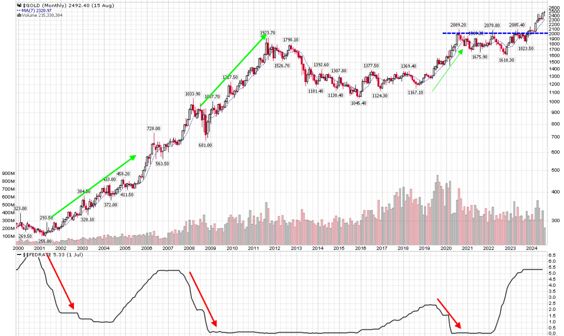 Figure 8 - Historically, gold reacts very positively to rate cut cycles (Author created with price chart from StockCharts.com)