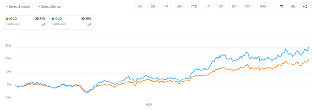 So far, the IGLD ETF has delivered a solid performance, with 20% in total returns since my article (Figure 1). However, IGLD has underperformed GLD over the same time frame, as GLD has returned more than 30%.
