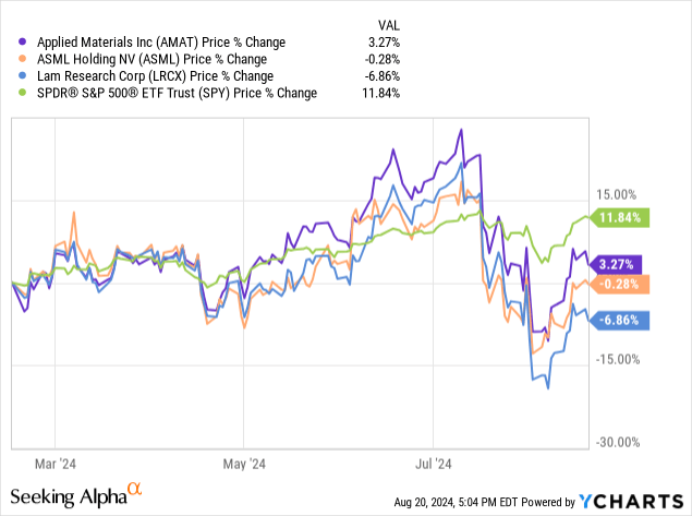 We're more positive about seeing the necessary cuts from Fed Chair Jerome Powell this Fall as the market anticipates an interest rate cut in September. The lower interest rate environment, coupled with the downside from dependency on China for financial outperformance being recognized, should make AMAT stock better positioned to significantly outperform in 2025. We say we load up on pullback this quarter; AMAT and its semi-cap peer group underperformed the S&P 500, with the semi-downturn in July providing a more attractive risk-reward profile for longer-term investors to begin exploring entry points. The following chart outlines AMAT's stock performance over the past six months against ASML, LRCX, and the S&P 500.