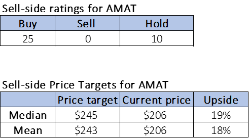 Wall Street shares our bullish sentiment on the stock, with 25 out of the 35 analysts covering the stock recommending a buy and 10 recommending a hold; that's also a notable improvement from the sentiment last time we wrote on AMAT when there were more bearish sell-side ratings. Sell-side price targets on the stock confirm more of the same, with the median sell-side price target for $245 and the mean for $243, with a potential upside of 18-19% compared to the forecasted upside of 2-3% late last year. The following charts outline AMAT's sell-side ratings and price targets.