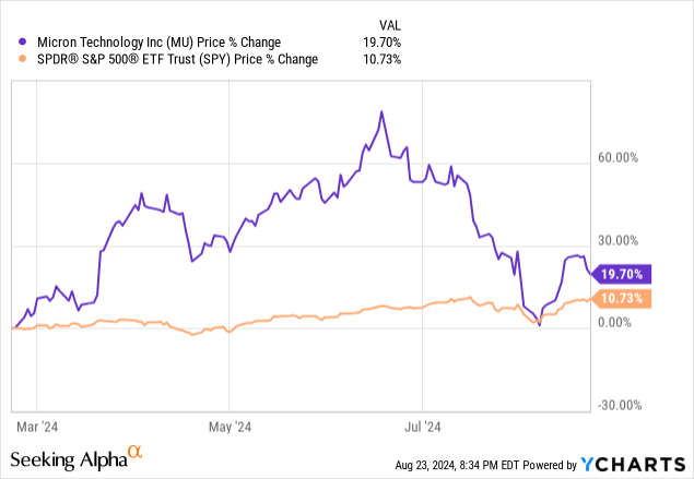 Last year, DRAM and NAND prices declined significantly due to oversupply in a weak end-demand environment post-pandemic; the following report from last year captures how bad the memory price decline was: "DRAM prices have fallen 57% since Q3-21 ($0.54 to $0.30 in Q1-23) while NAND prices have fallen 55% during the same period." The downturn began to ease in 2H23, which is when we pushed our bullish sentiment on the stock, and also when MU management raised their forecast for 1Q24. And, indeed, we've seen DRAM and NAND prices recover this year: Taiwan's TrendForce reported in late July that "DRAM and NAND Flash revenues are expected to see significant increases of 75% and 77%, respectively, in 2024." The upside this year is on a recovery from the lows of last year instigated by 1. better memory demand-supply dynamics as "memory manufacturers' strict control of supply and output has led to increasing prices from the start of November" 2023 and 2. Heightened demand for high bandwidth memory or HBM due to AI value and use. We think both these factors remain at play, but the market has already priced in the positives. Hence, we don't see a favorable risk-reward profile for the stock for the back end of the year.